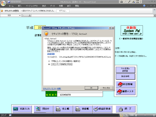 9.ここから、本年BOOKの操作です。 通常通り、マクロを有効にしPALACCa.xls を起動します。